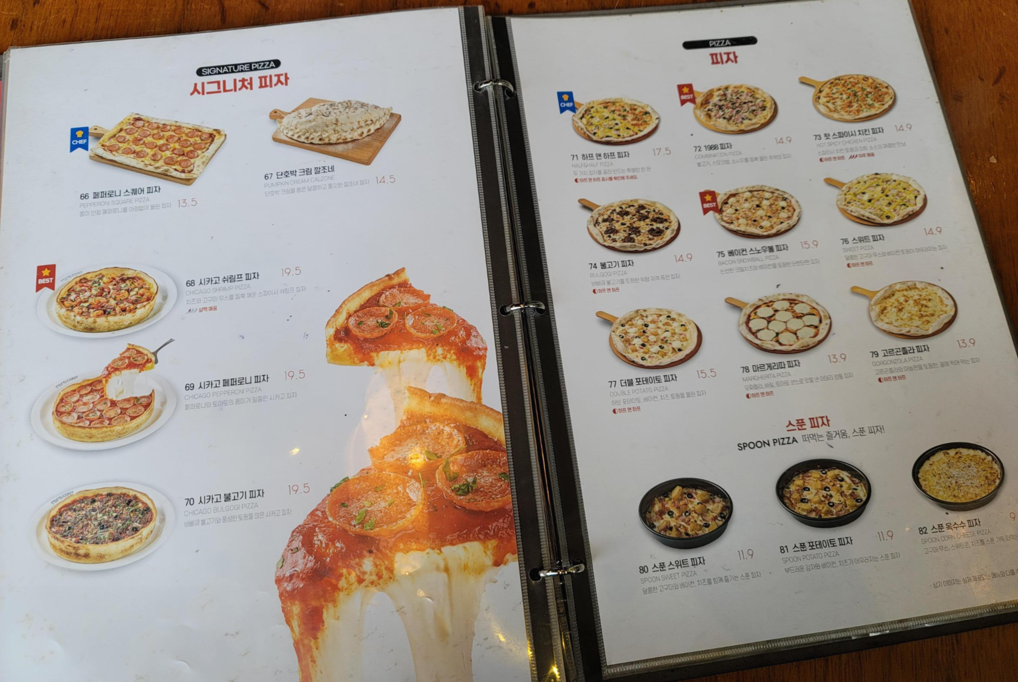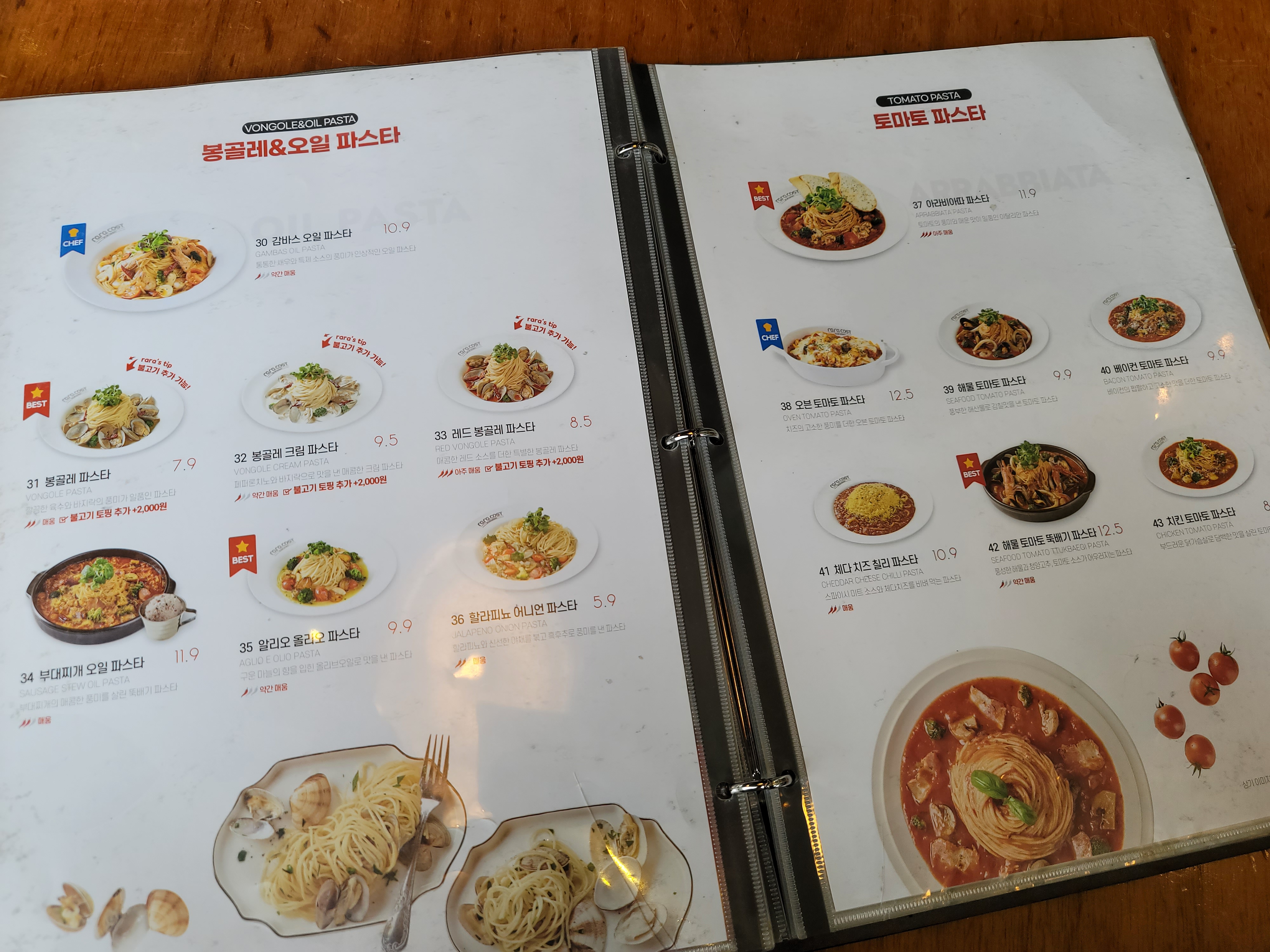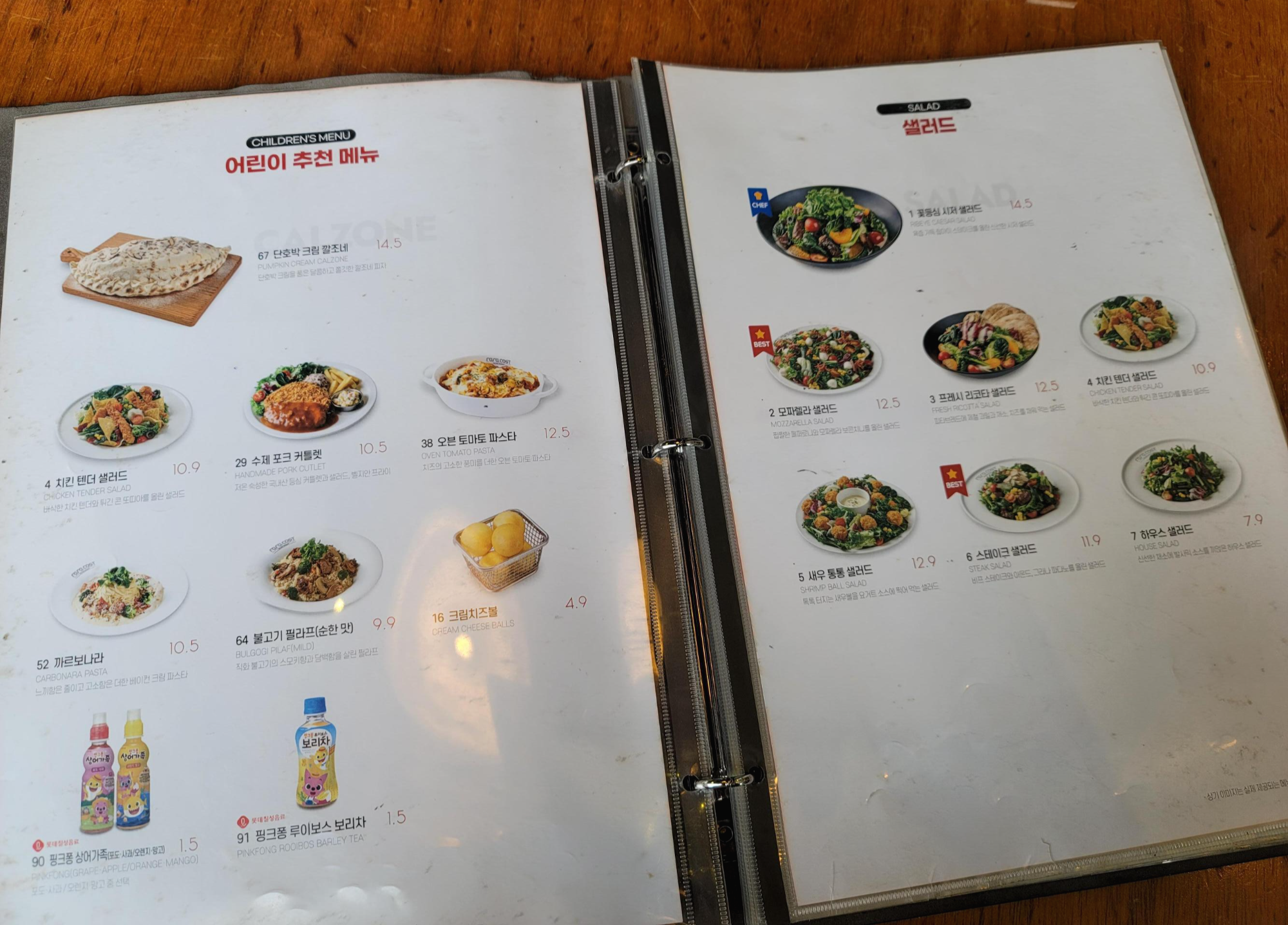 샐러드, 피자, 리조또, 스테이크, 파스타(오일, 크림, 토마토) 다양하게 있구요