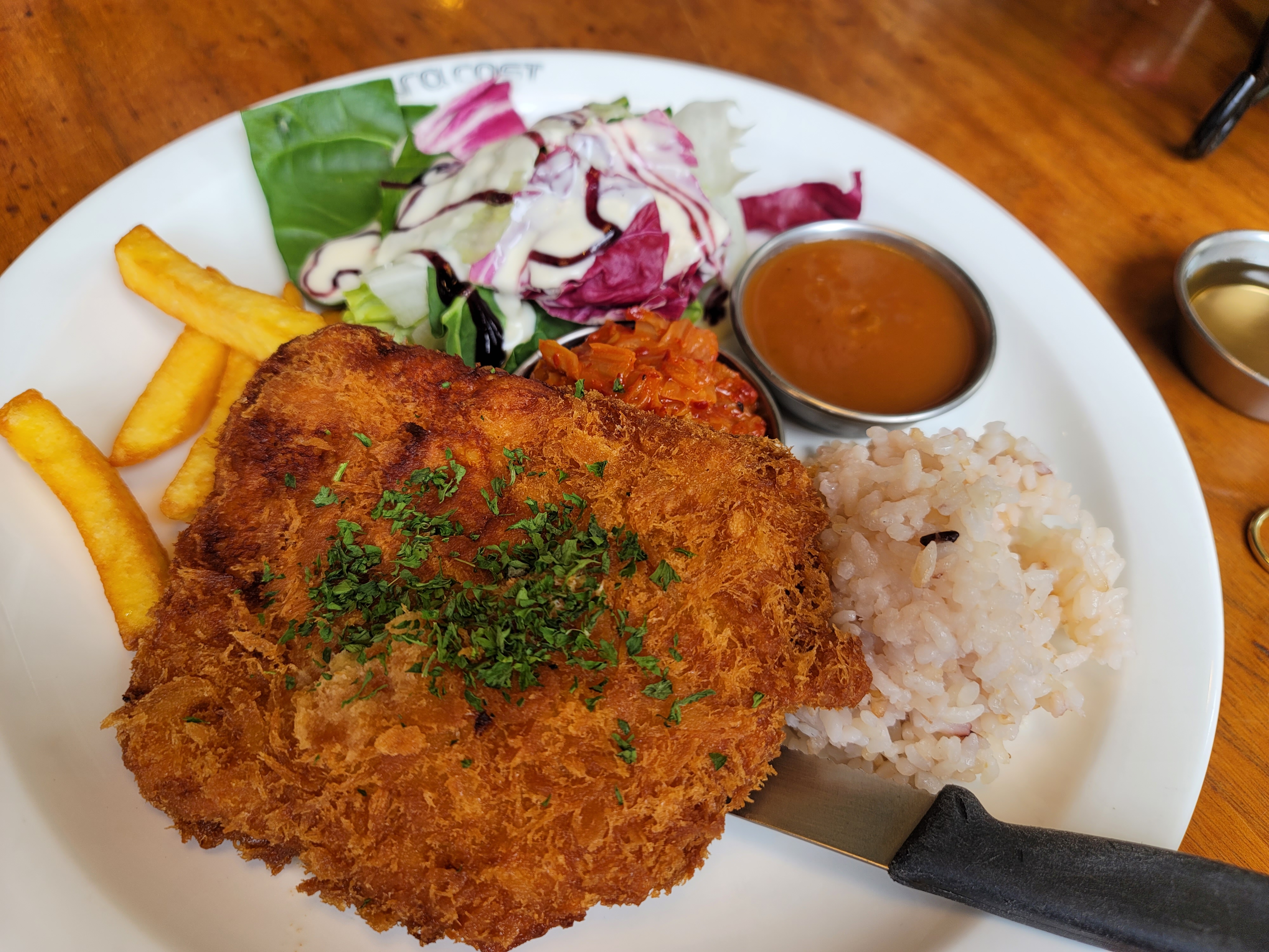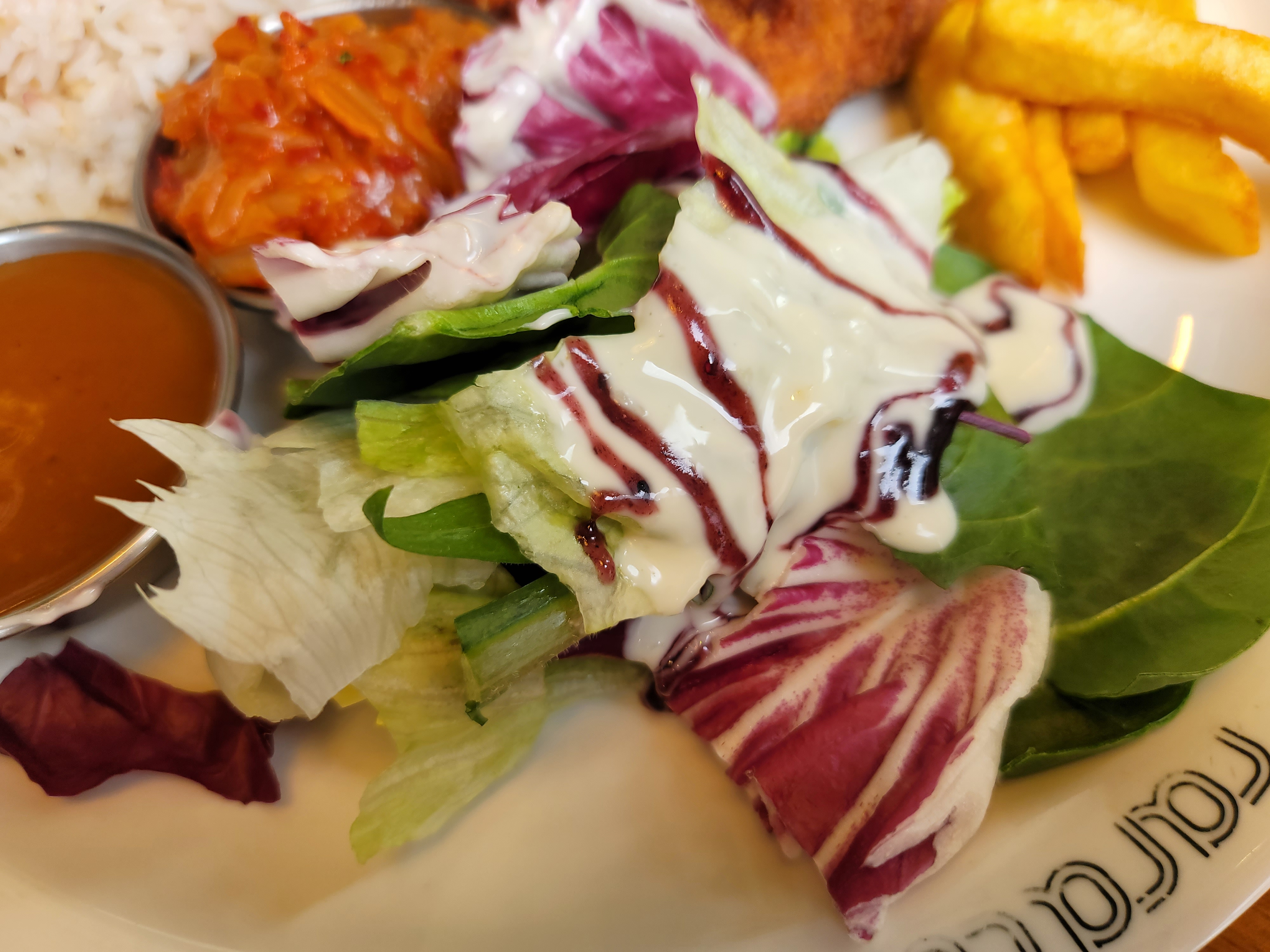 밥도 한스쿱 나오고, 샐러드와 감자인척 하는 고구마튀김도 사이드로 제공됩니다