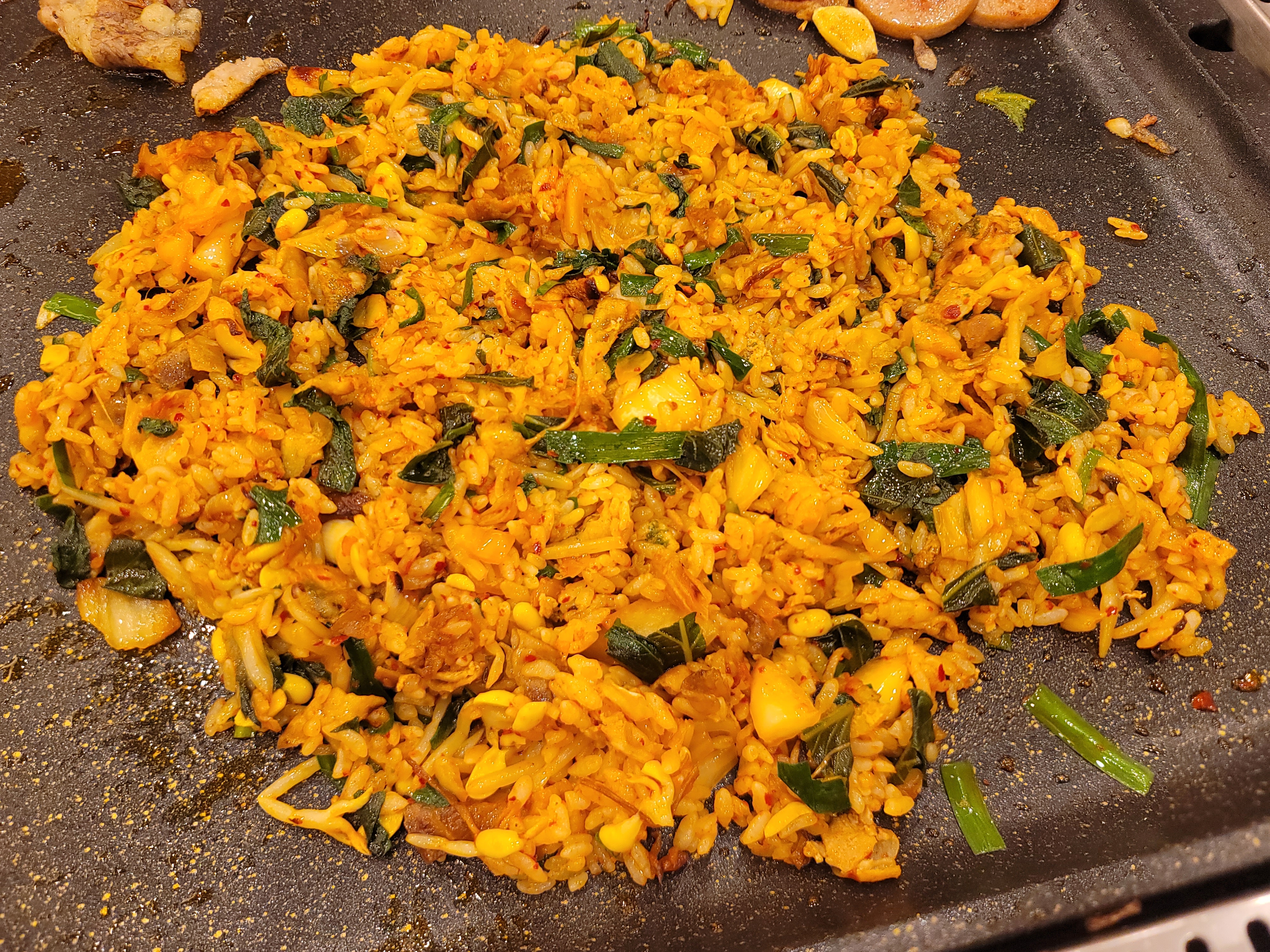 저희는 굽다 남은 김치, 콩나물, 고기, 버섯을 넣고 볶다가 부추랑 깻잎까지 넣어 마무리 했네요